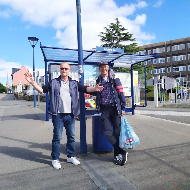5 juli 2022. Stefan och jag skulle ta bussen upp till en linbana i Brest. Den bussen var inställd hela juli. Det var bara att börja promenera uppåt i trapporna. Linbanan "Le Téléphérique" går mellan Capucins och rue de Siam. Den går över ett militärområde och vattnet.